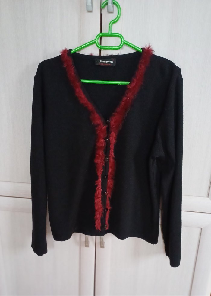 Kırmızı kürk detaylı, V yakalı, uzun kollu, fitted kesim triko hırka. Günlük kullanıma uygun gotik tarzda şık bir parça.