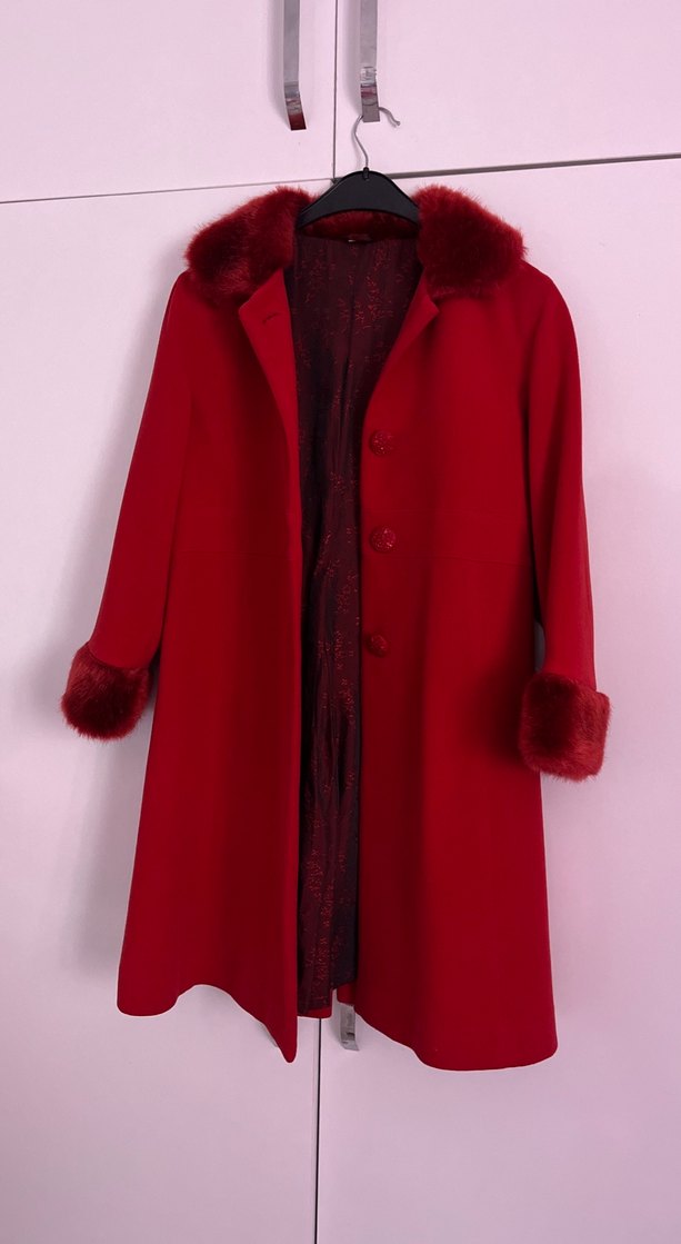 Kırmızı kaban, yaka ve manşetlerde kürk detaylarıyla sıcak ve şık bir görünüm sunar. Düğmeli kapama ve astar bulunur.