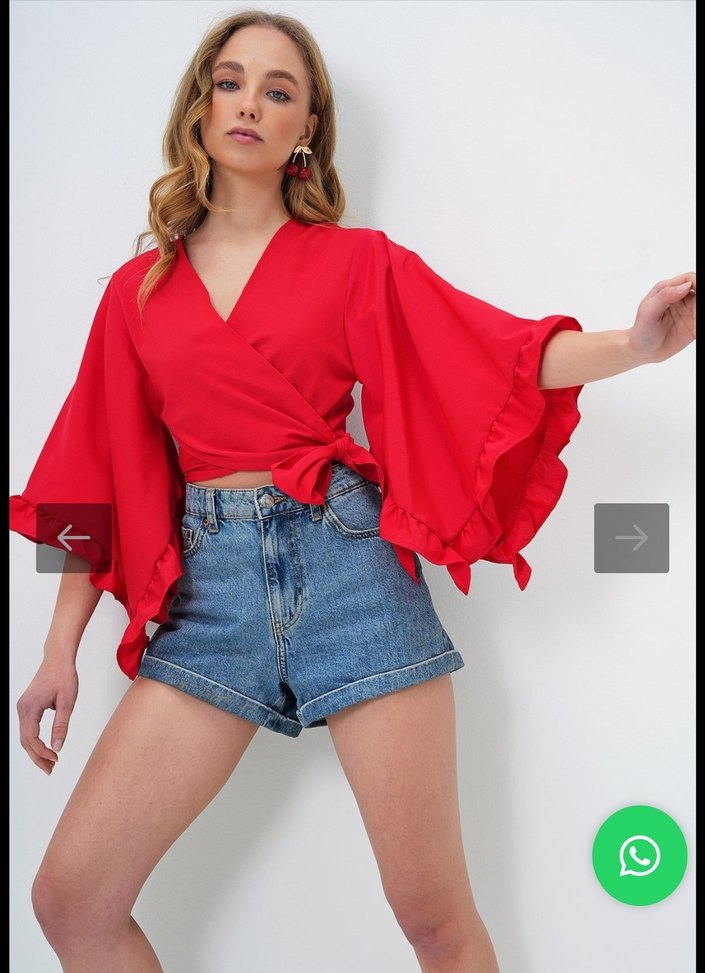 Kırmızı denim kumaştan, V yakalı, kısa ve bol kollu, kuşaklı bel detayıyla günlük kullanıma uygun şık bir bluz. bendeki bu modelin Gül kurusu fuşya arası bir renginde bu renk değil yani