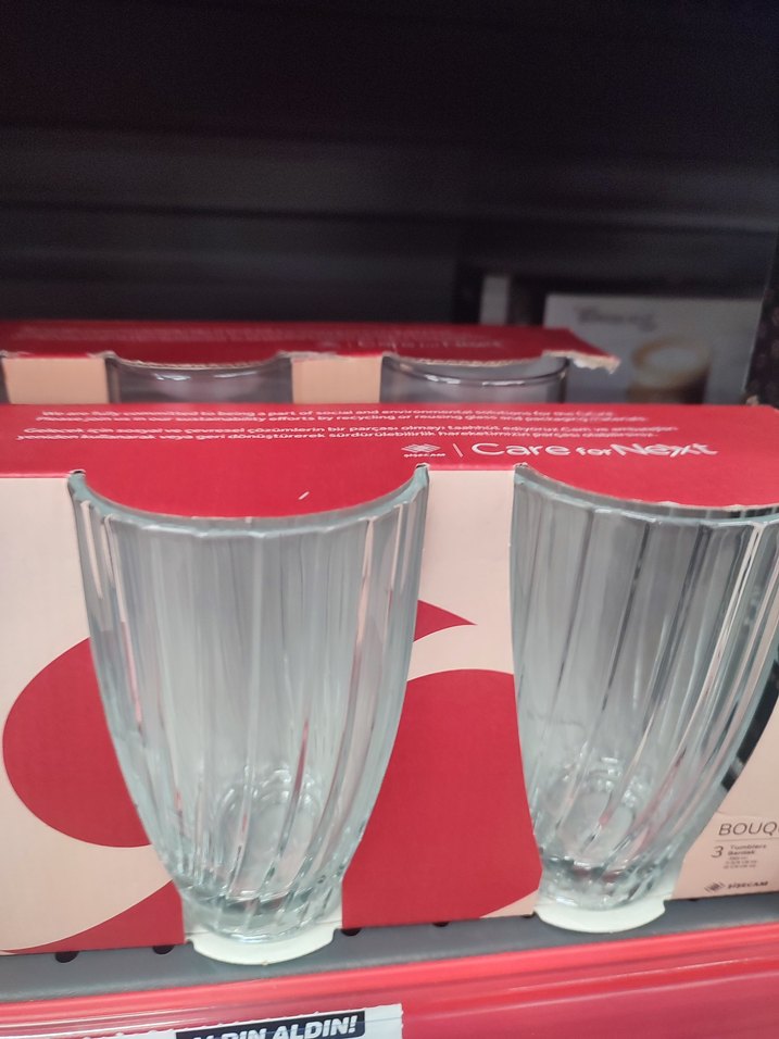 Kırmızı kutuda 3 adet şeffaf, kabartmalı cam bardak seti. Hafif ve zarif tasarımıyla çeşitli içeceklere uygundur.