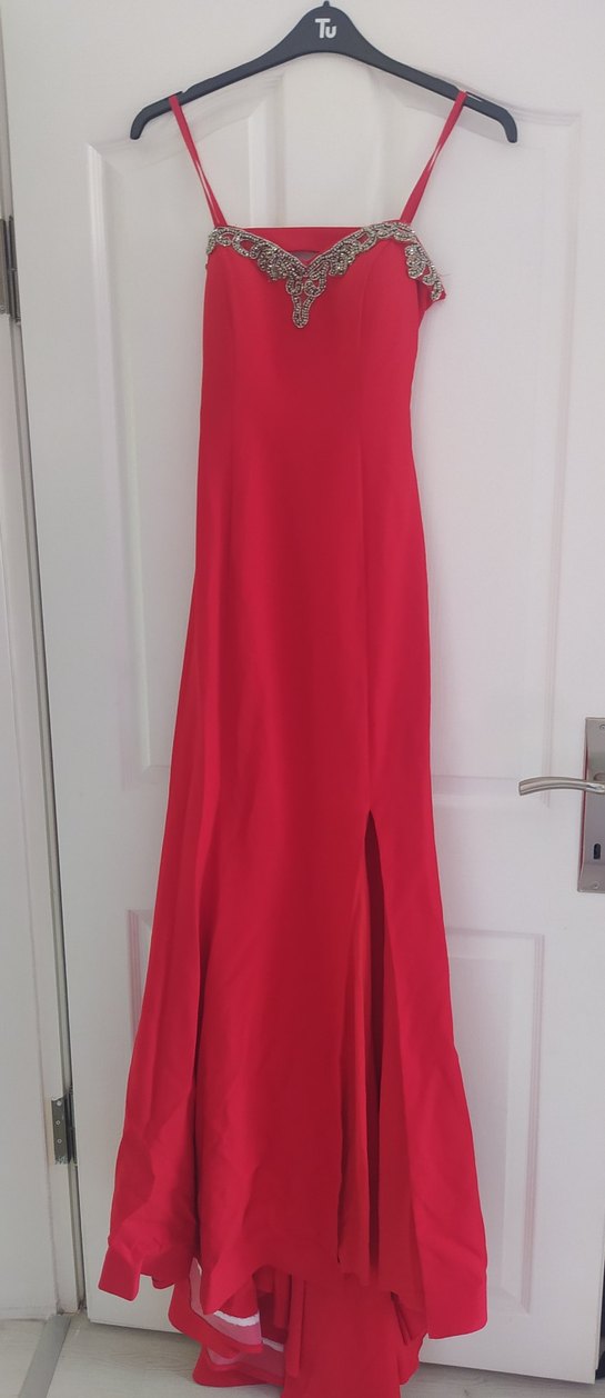 Kırmızı parlak kumaştan, drapeli, uzun ve kolsuz abiye elbise. Tek renk, tekne yaka ve klasik şıklık sunar. Düğün için uygundur. Boy:1,56 Kuyruk dahil boyu:1.85