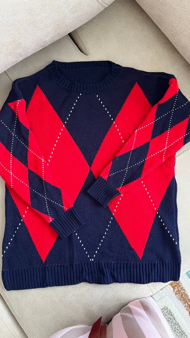 Kırmızı Lacivert Baklava Desenli Oversize Kadın Kazak