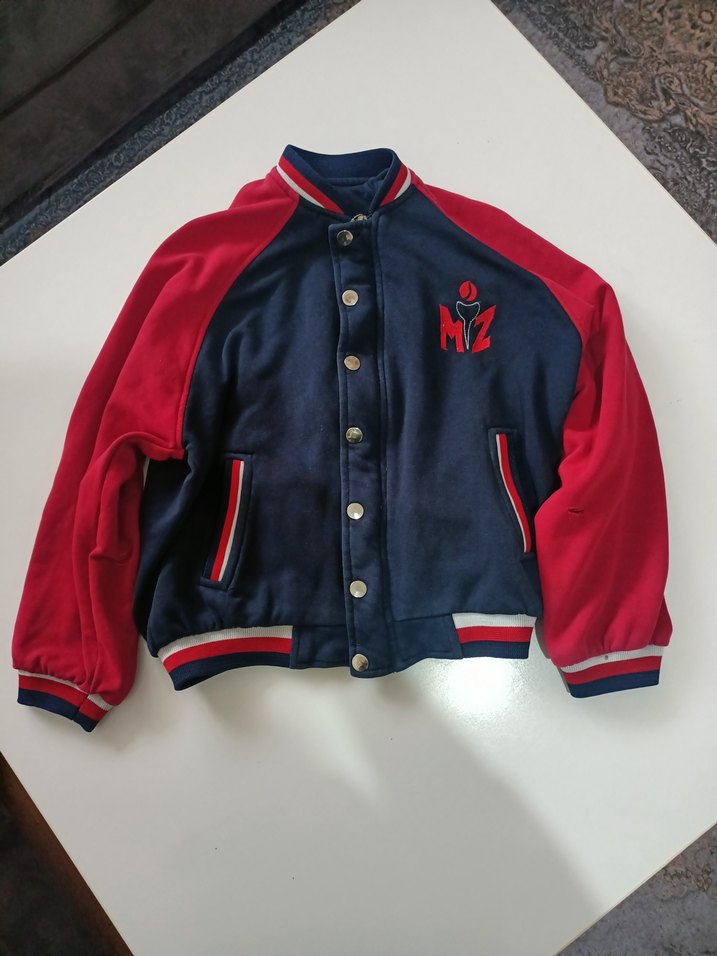 Düğmeli ve kesik yaka detaylı, yumuşak dokulu, kırmızı ve lacivert renklerde, sokak stili erkek çocuk ceketi. kolunda bir yırtık olup dikilebilir, yumuşacık ve sağlam penye kumaşı vardır