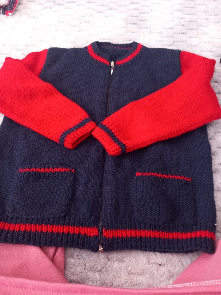 Kırmızı ve lacivert renklerde, fermuarlı, cepli, düz örgü erkek çocuk hırkası. Dar kesim, yuvarlak yaka ve uzun kolludur.