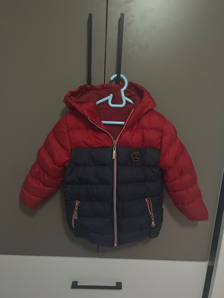 Fermuarlı ve cepli, kırmızı-lacivert renk bloklu, erkek çocuk montu. Notch yaka ve yumuşak, sıcak kumaşla günlük sokak tarzı için uygun.