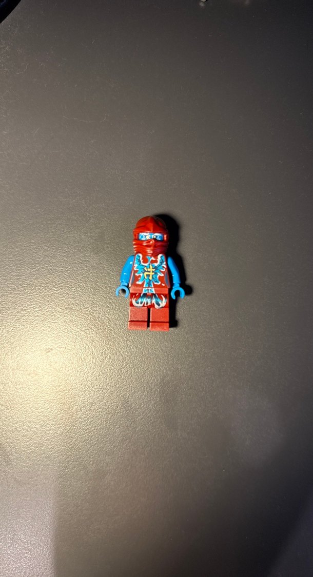 Kırmızı kapüşonlu ve maskeli, detaylı baskılı kırmızı-lacivert Lego ninja figürü.
