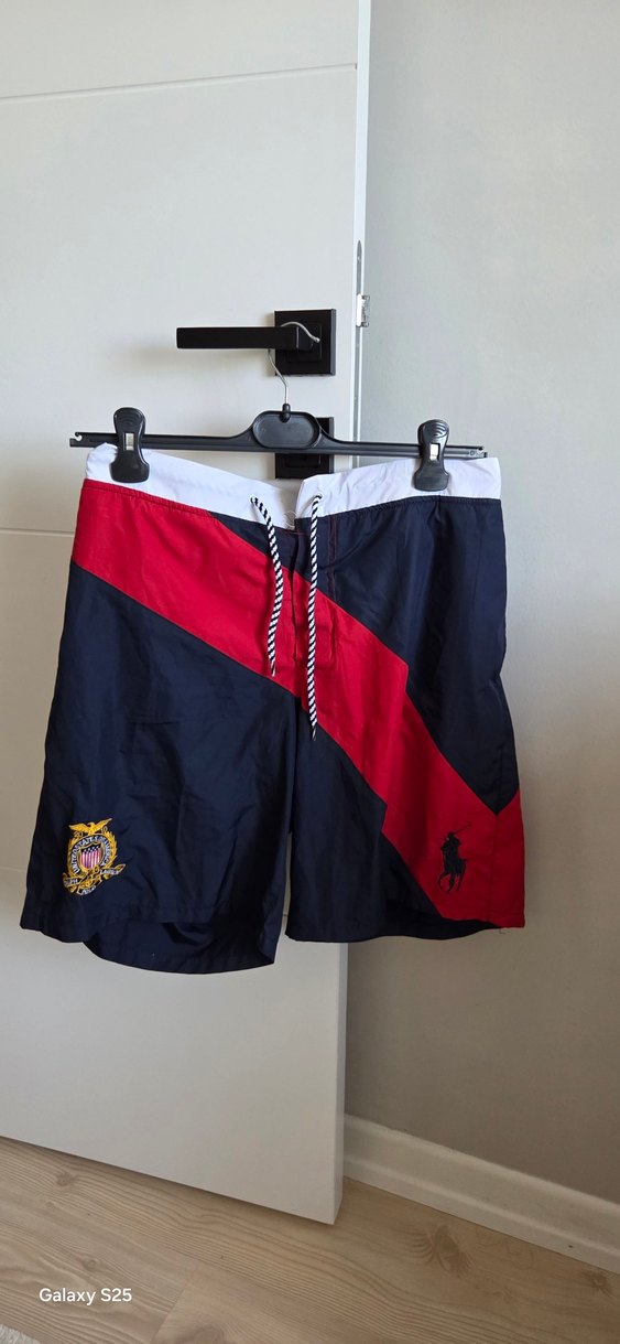 Kırmızı ve lacivert renk bloklarıyla, kemerli ve baskılı detaylı, sıkı kesim erkek deniz şortu. xl ama bence L giyen alsın