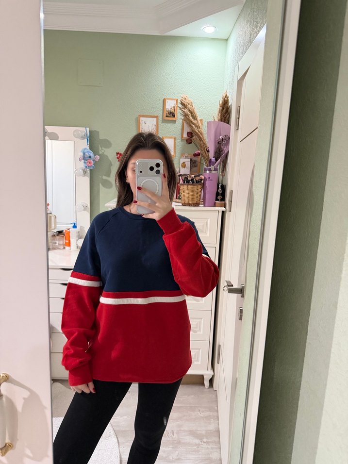 Kırmızı ve lacivert renklerin kullanıldığı, uzun kollu, oversize kesim sweatshirt. Rahat ve sıcak kumaşıyla günlük kullanıma uygun.