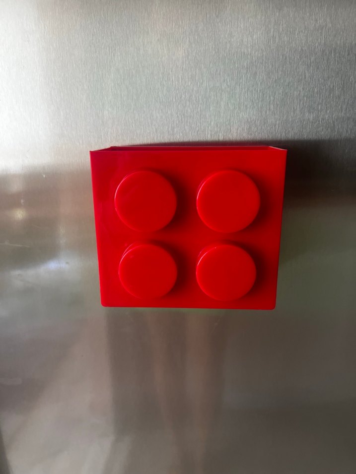 Renkli kırmızı Lego blok magnet, dört çıkıntılı ve içerisine kalem not kağıdı açacak birsürü şey konulabilinir Metal yüzeylere kolayca yapışır.