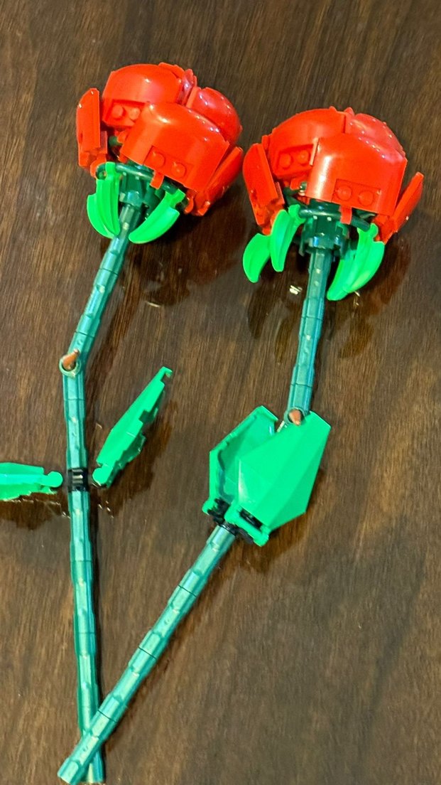 Bu renkli Lego setinde, birbirine geçen tuğlalardan yapılmış kırmızı çiçekler ve yeşil saplar yer alıyor.