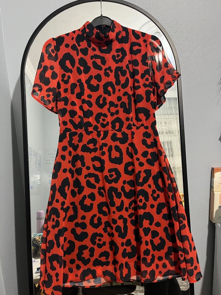 Kırmızı leopar desenli mini elbise, kısa kollu ve yüksek yakalı. Hiç giyilmedi hiçbir sorunu yoktur kemer detayı mevcuttur.