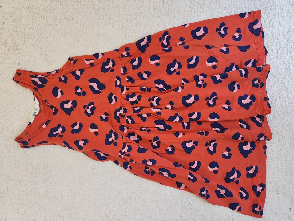 Kırmızı leopar desenli, salaş kesim, kolsuz kız elbisesi. Yuvarlak yaka ve fırfır detaylı, yumuşak sentetik kumaştan üretilmiştir.