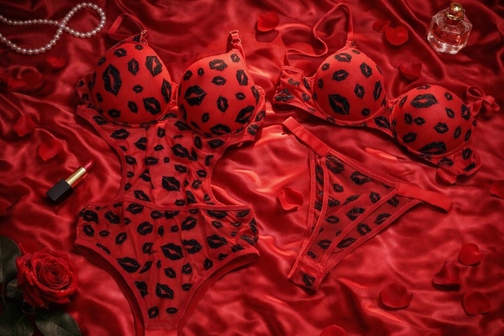 Kırmızı, leopar desenli ve kısa kesim tarzında, gösterişli pop kültür esintili sütyen.