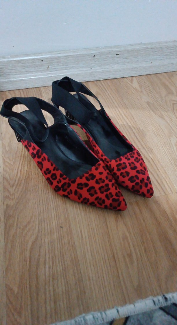 Kırmızı leopar desenli, tokalı bantlı kadın stiletto topuklu ayakkabı, esnek kauçuk malzemeden, romantik akşamlar için uygun.