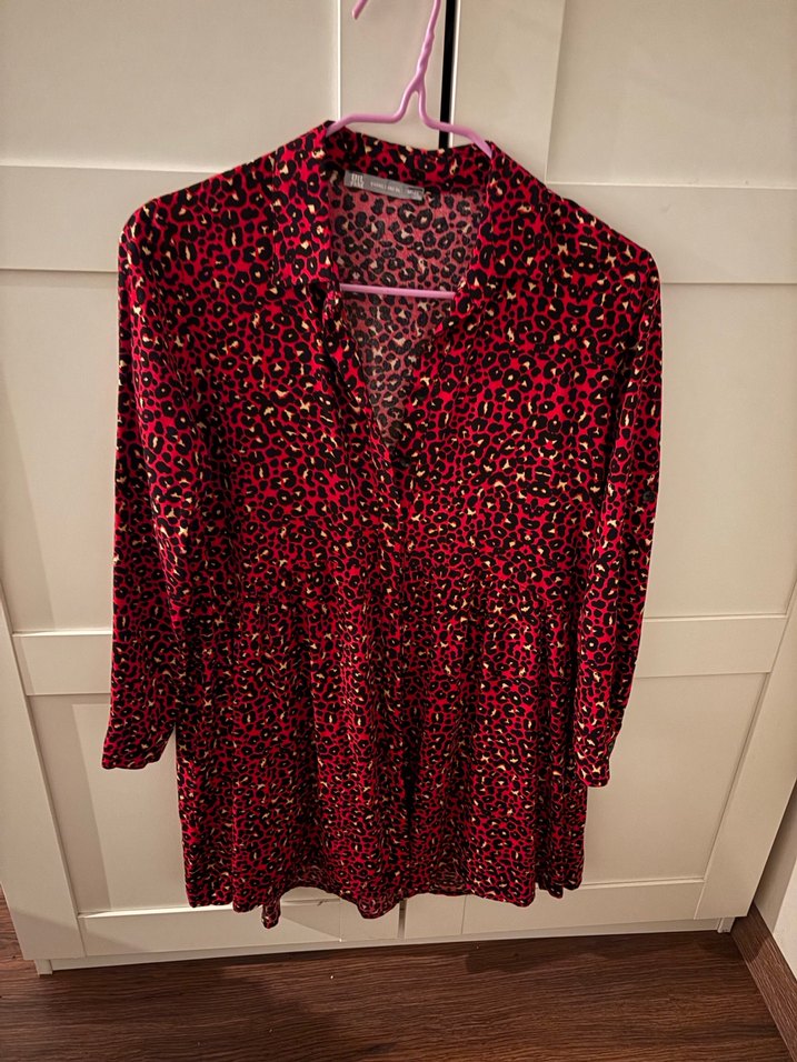 Zara da olan bir modeldi. Giyilmedi küçük geldi. Kırmızı, leopar desenli, V yakalı, uzun kollu, düğmeli ve bol kesim tunik