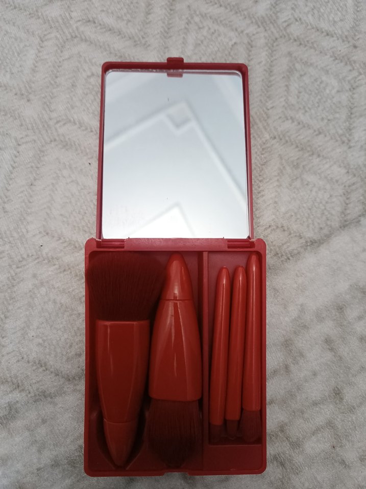 Çeşitli fırça tipleri ve yerleşik aynasıyla kırmızı makyaj fırçası seti, kolay uygulama sağlar. Canlı koyu kırmızı renk.