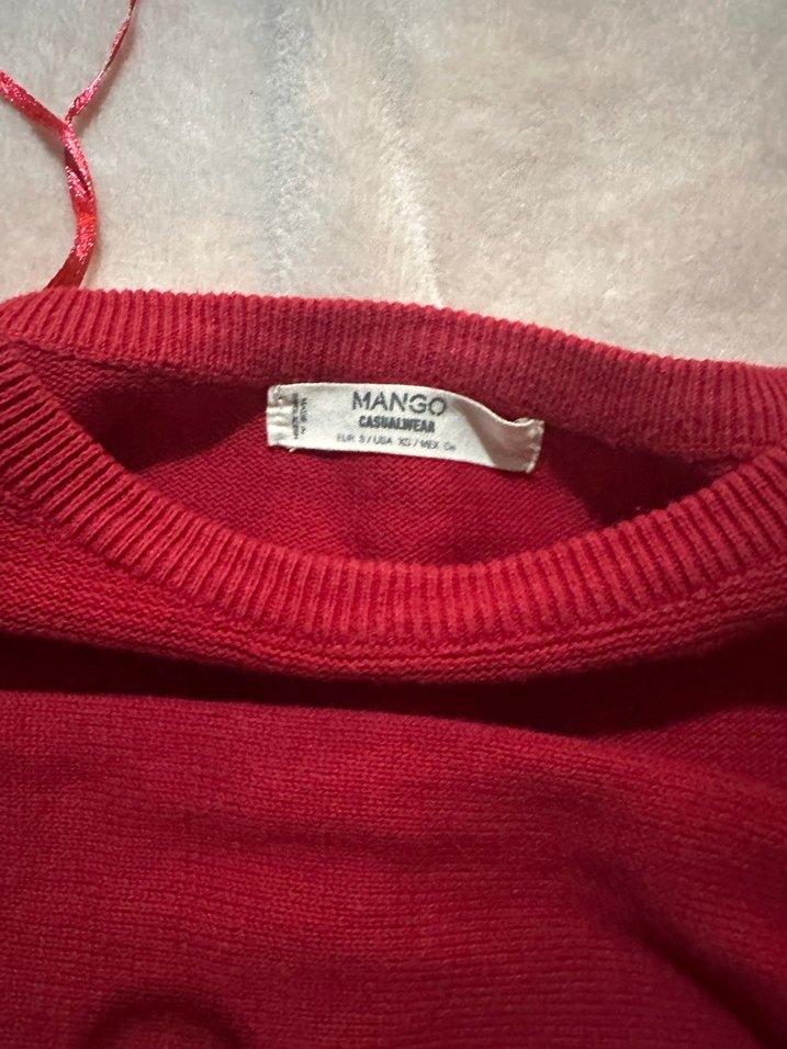 Mango marka kırmızı renkli, uzun kollu, bisiklet yaka, örgü kumaştan yapılmış, normal boyda kadın triko kazak. Rahat ve şık bir görünüm sağlar.