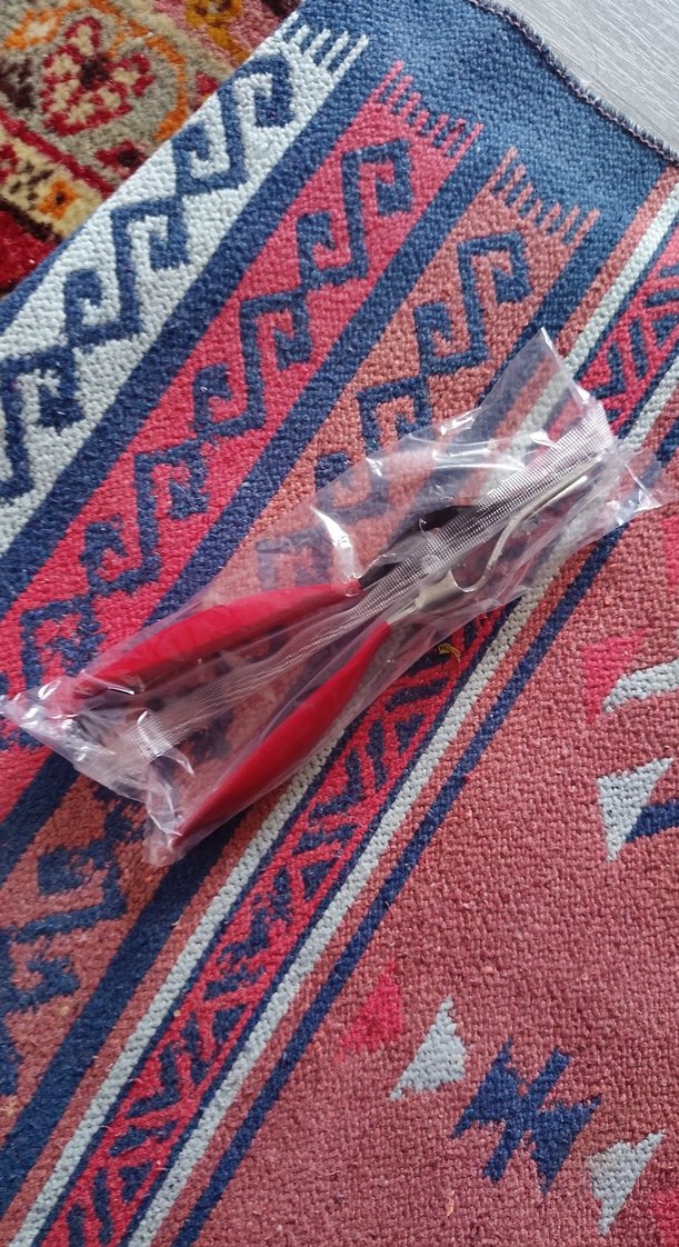 Kırmızı renkli saplara sahip manikür ve pedikür aleti, şeffaf plastik ambalajda sunulmuştur. Tırnak bakımı için hassas uçludur.