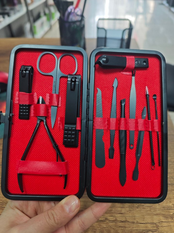 Koyu kırmızı renkte, tırnak makası, makas ve tırnak bakım aletleri içeren kompakt manikür ve pedikür seti.