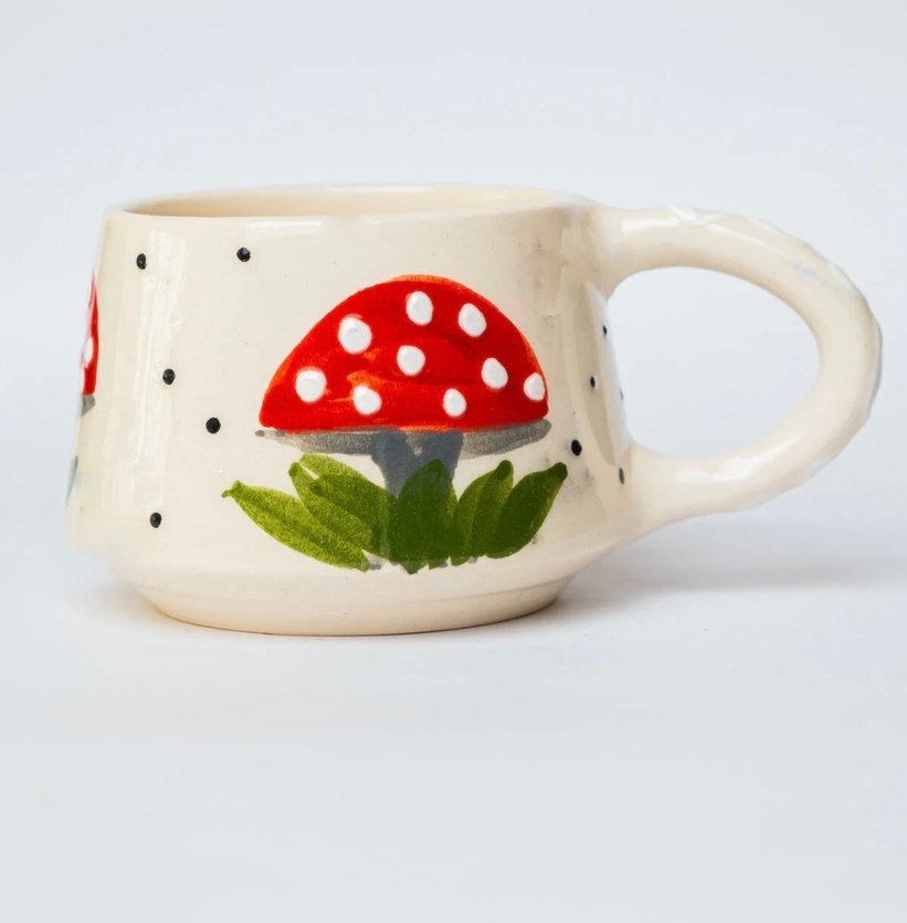 Krem renginde, kırmızı mantar ve yeşil yaprak desenli, siyah noktalarla süslenmiş seramik kupa.