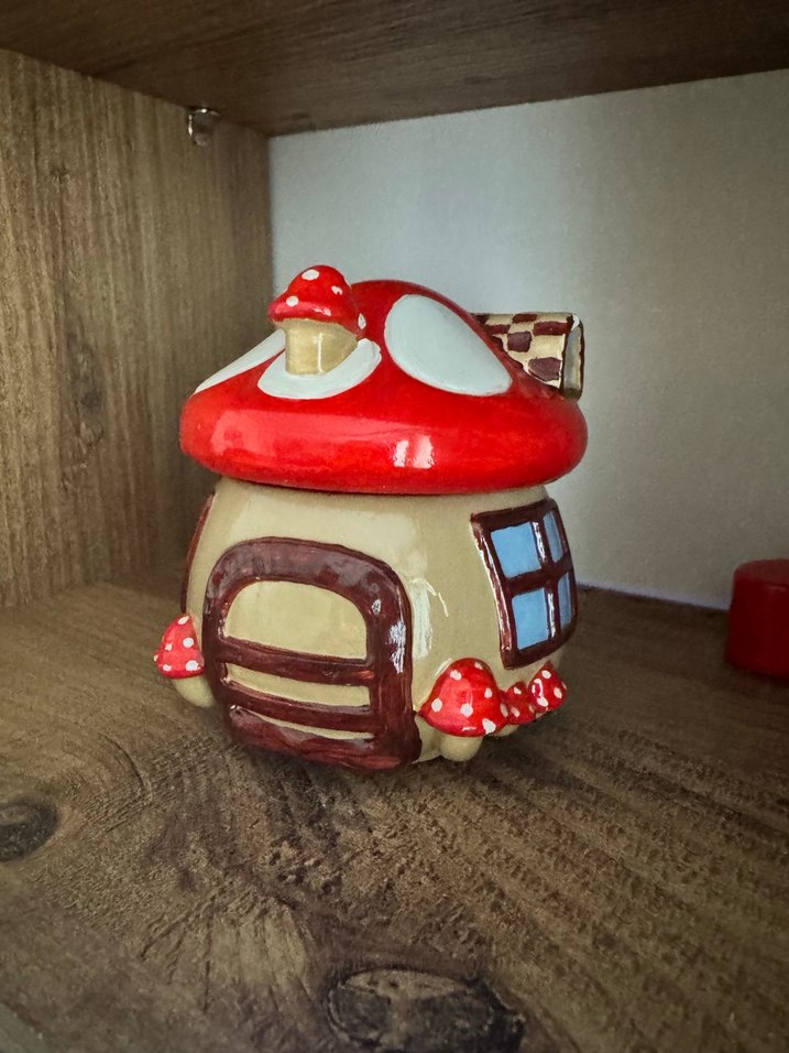 Bu renkli figürin, kırmızı mantar şapkalı, kahverengi kapılı ve mavi pencereli küçük bir mantar evini gösterir.