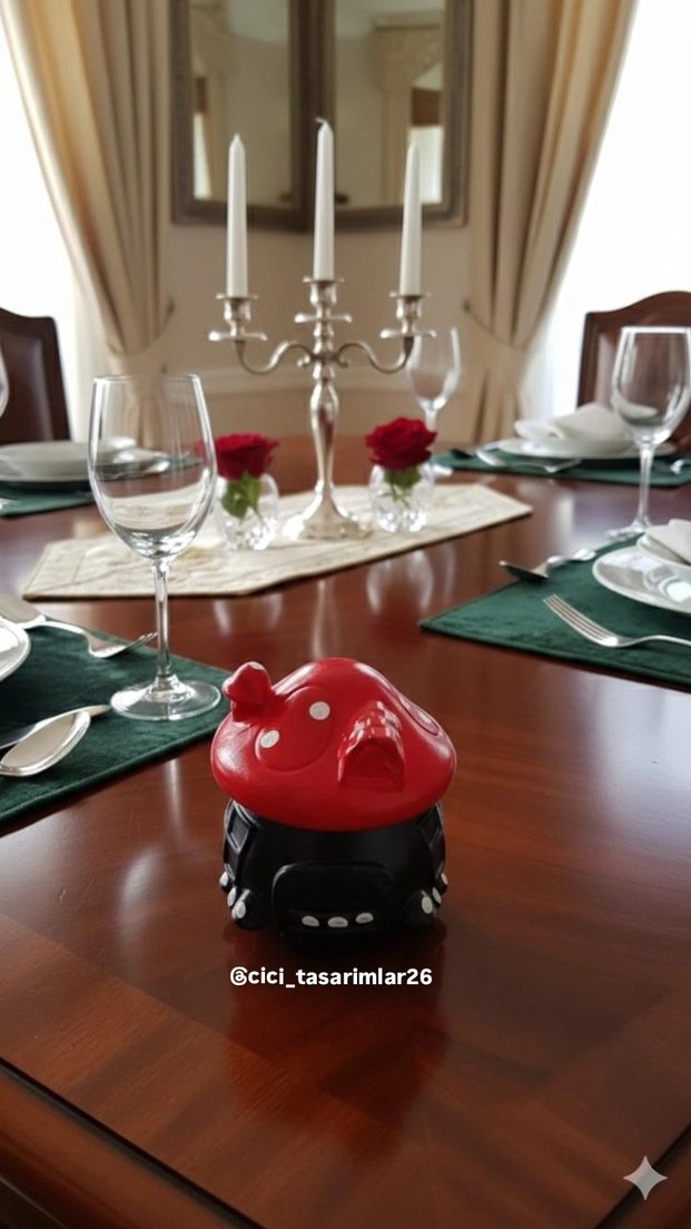 2 Adet Mevcuttur Adet fiyatı 100 TL Takı Kutusu Mumluk Olarak Kullanabilirsiniz Beyaz benekli koyu kırmızı mantar şeklinde dekoratif obje, ev dekorasyonuna şık bir dokunuş katıyor. @cici_tasarimlar26 etiketi bulunur.