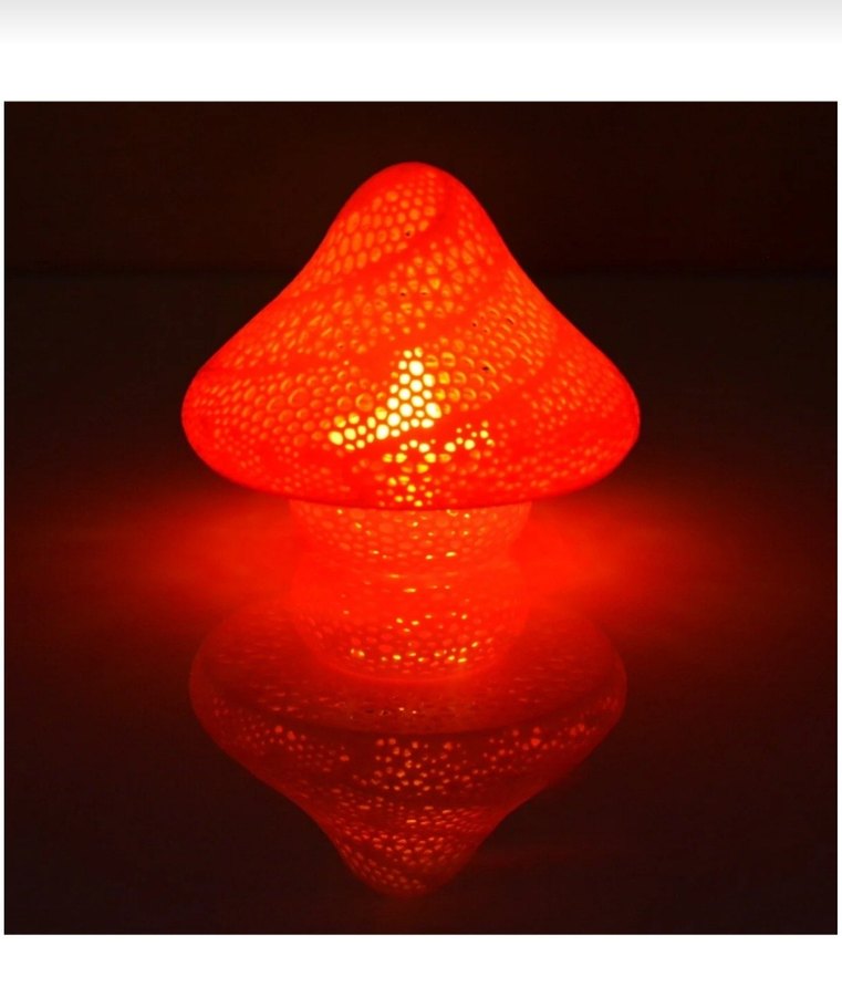 Delikli tasarıma sahip kırmızı mantar şeklinde masa lambası, renkli ışık desenleri oluşturur ve sıcak bir ortam sağlar. sert plastiktir.
