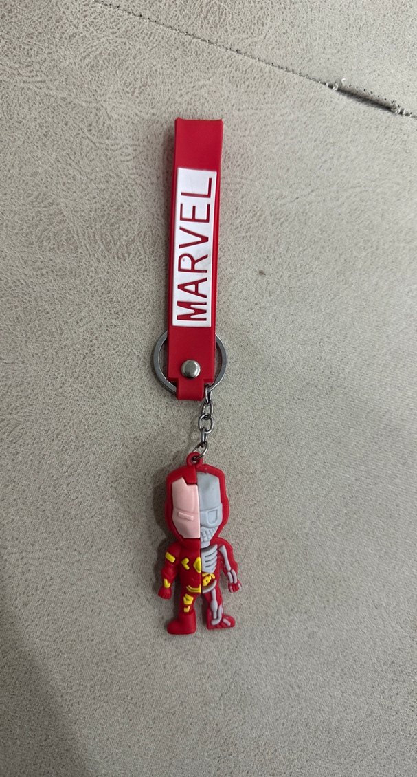 Renkli Marvel karakter figürlü, zincir detaylı kırmızı anahtarlık, sokak stili ve minimalist rock punk tarzını yansıtıyor.