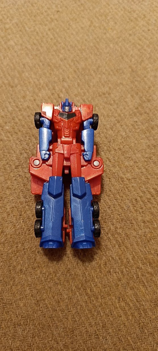 Koyu kırmızı ve mavi renklere sahip, hareketli eklemleri ve detaylı tasarımı olan robot aksiyon figürü. Bacaklarında tekerlekler bulunur.
