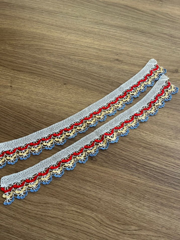 Kırmızı, mavi ve sarı işlemeli beyaz tabanlı dantel şerit, geleneksel el işçiliği detaylarıyla hazırlanmıştır.