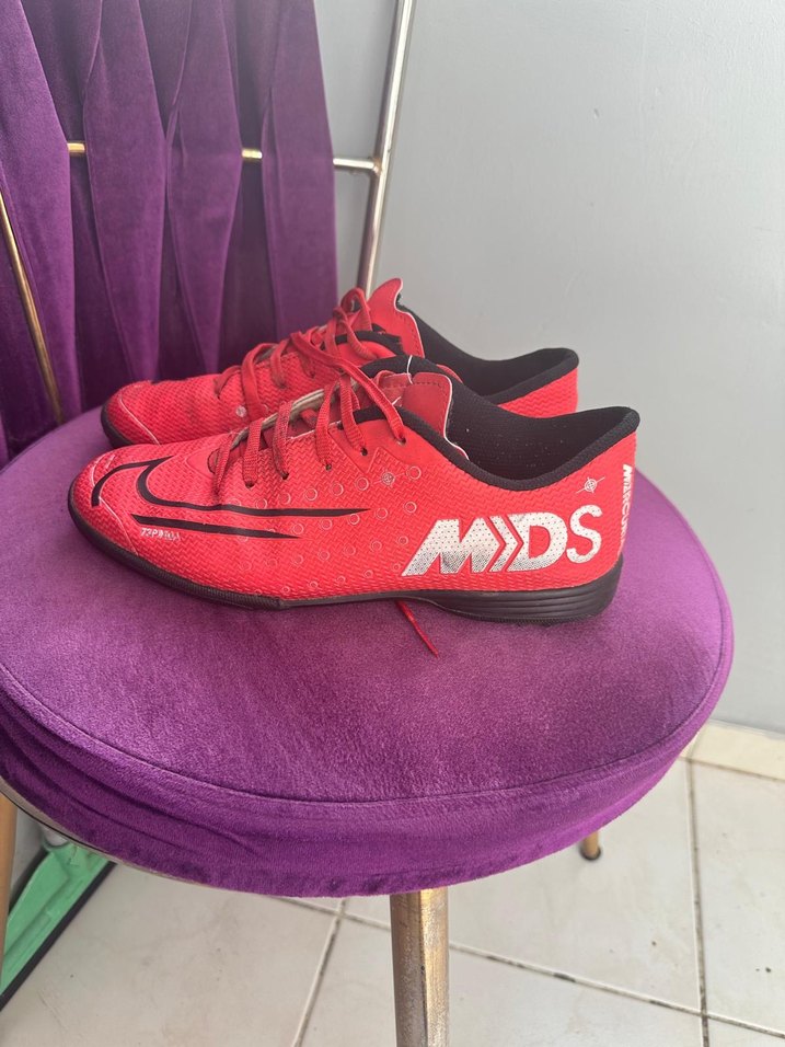 orjinal nike Kırmızı renkli, renkli baskılı ve Velcro özellikli erkek futbol ayakkabısı. Kauçuk malzemeden üretilmiş, yan tarafında "MDS" yazısı bulunur. ⚽