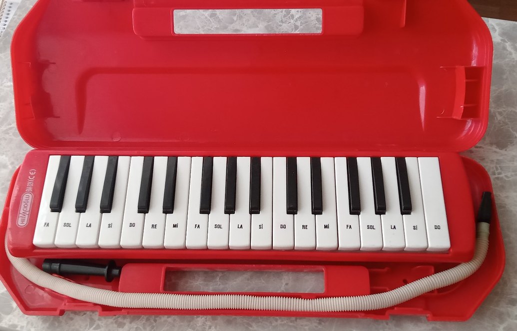 Kırmızı melodika, tuşlarında SOL dahil renkli nota işaretleri bulunur. Çalmak için esnek beyaz boru mevcuttur.