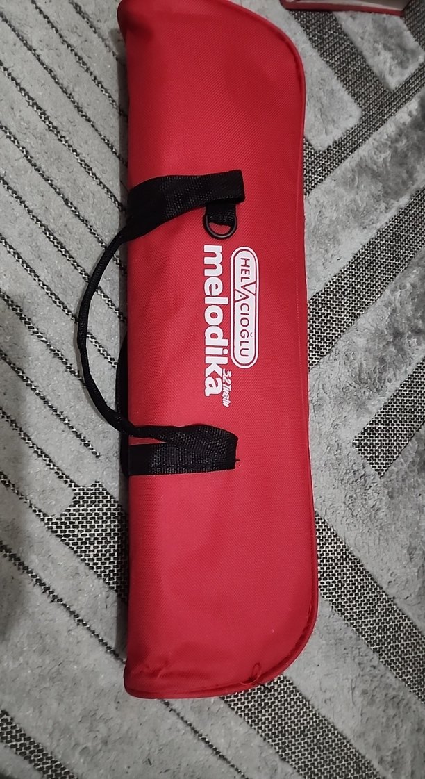 Kırmızı renkte, siyah saplı, 'melodika' ve 'HELVACIOGLU' çantalı