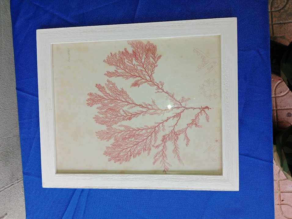Beyaz çerçevede açık kırmızı deniz bitkisi resmi bulunur. İnce dallanma desenleri bej zemin üzerinde yer alır.