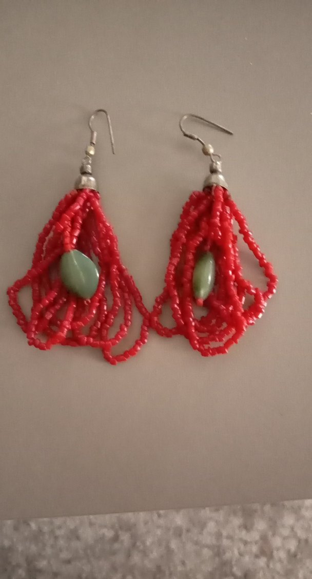 Kırmızı mercan ve yeşim oval detaylı, bohem tarzda günlük kullanıma uygun küpeler.
