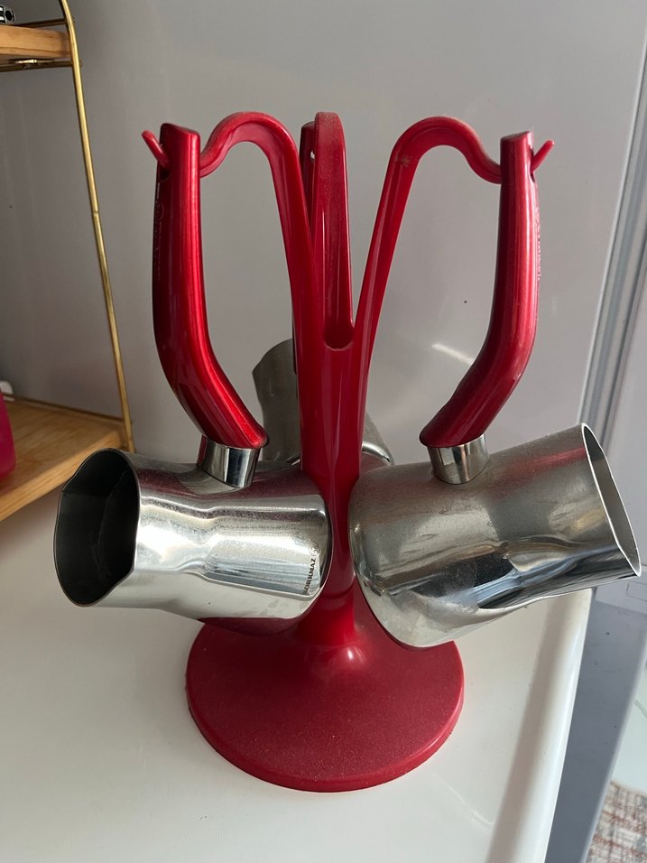 Canlı kırmızı stand üzerinde metal saplı üç cezve bulunur. Kahve servisinde kullanıma uygundur ve sağlam tabanı ile düzen sağlar. ☕