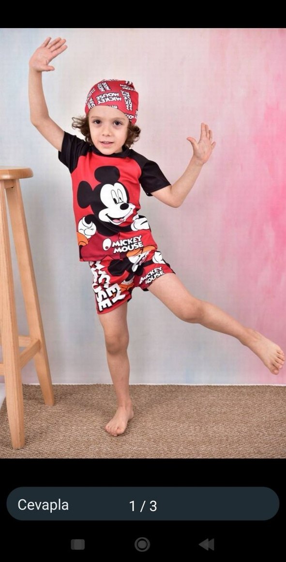 Kısa kollu, renkli kırmızı Mickey Mouse baskılı erkek çocuk mayo takımı. Üst ve şortlu, eğlenceli desenlere sahip. ️