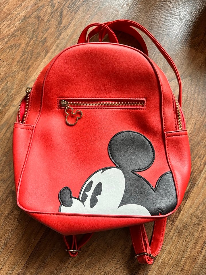 Kırmızı renkli çantası, önünde gri ve beyaz Mickey Mouse figürü bulunur. Ayarlanabilir askıları vardır . Orjinal Disney ürünü tokasının bir tanesi düşmüş fiyat uygun