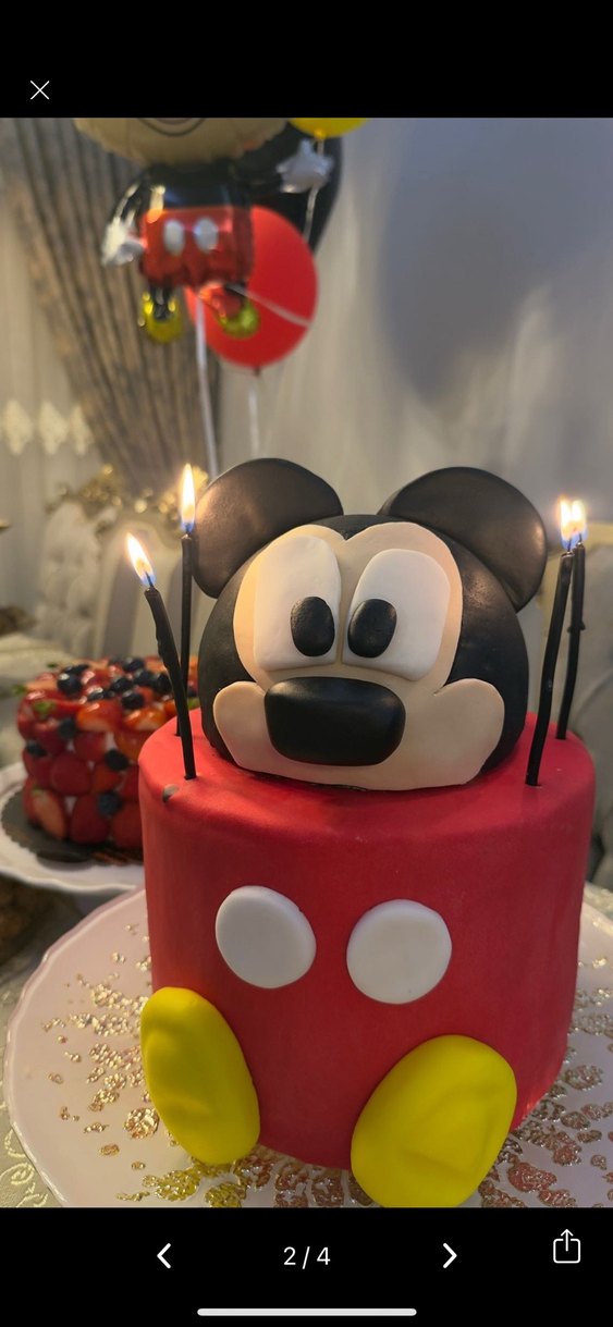 Koyu kırmızı taban üzerinde detaylı Mickey Mouse baş süslemeli pasta. Siyah mumlar ve alt kısmında sarı detaylar bulunur. Maket pastadır
