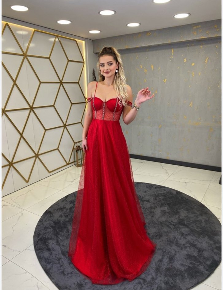 Transparan detaylı midi uzunlukta kırmızı abiye. Parlak kumaşıyla bohem tarzda, gösterişli düğünler için uygun, kolsuz ve desensiz.