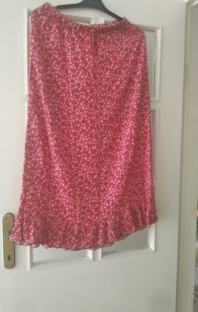 kırmızımidi boy, bol kesim, fırfırlı etek. Parlak tie-dye desenli,keten kumaştan, bohem tarzda günlük kullanıma uygun. beli lastikli