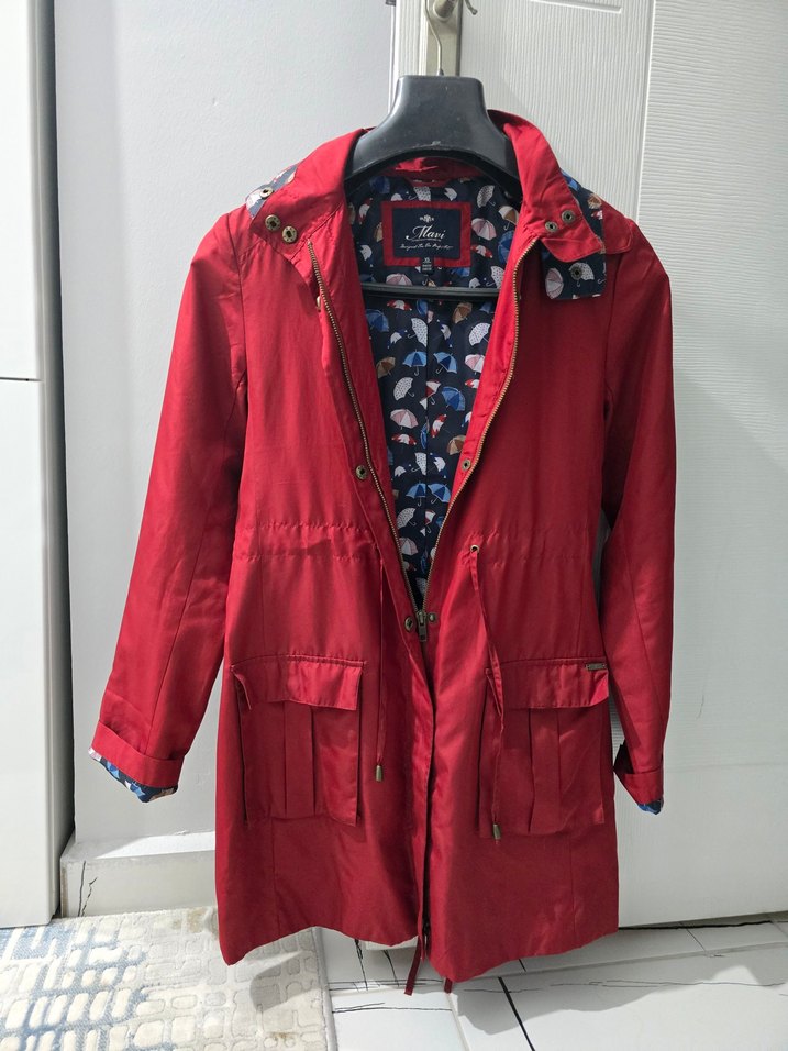 Kırmızı, fermuarlı, notched lapel yakalı, uzun kollu, bol kesim midi boy kadın yağmurluktur. Parlak yüzeylidir ve günlük rahat kullanıma uygundur. ️