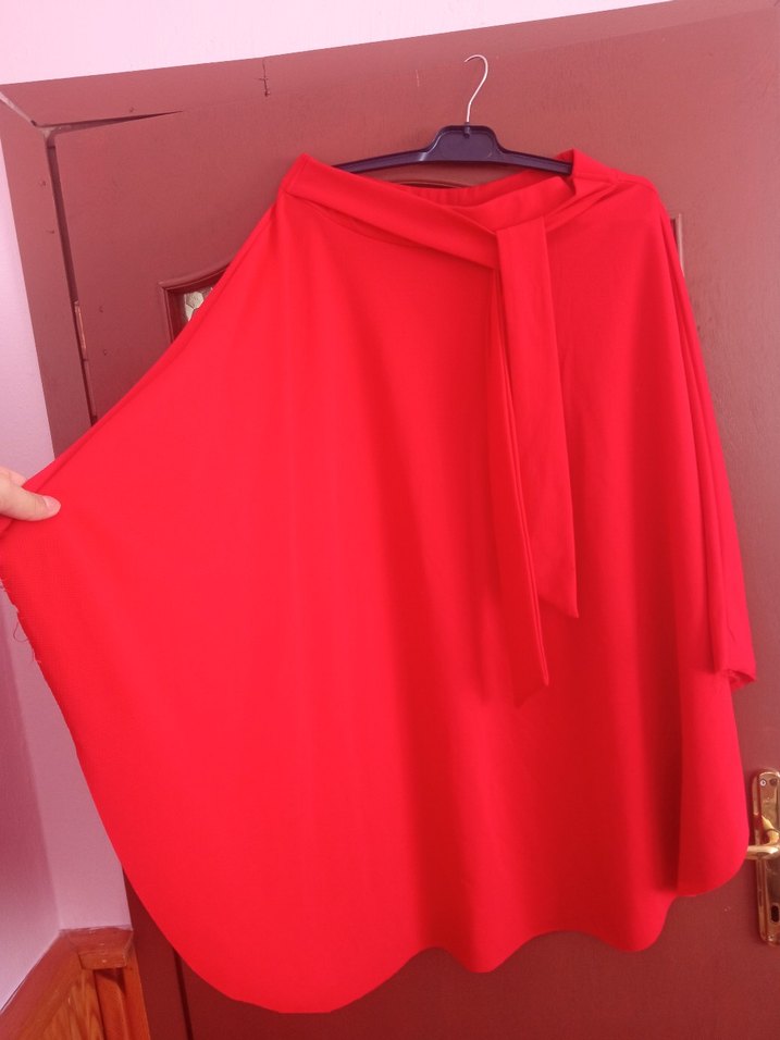 Kırmızı midi boy, salaş kesim, drapeli kadın etek, yumuşak ve sıcak kumaştan, günlük ve sokak stili için uygundur. önden bağlamalıdır. fotoğrafta parlak durmuş ama tamamen ışıktan kaynaklı son fotoğraftaki gibi kırmızısı