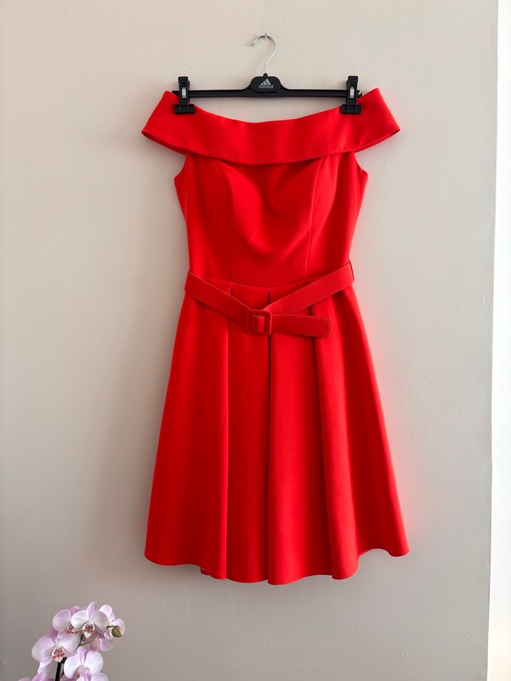 Kırmızı mini elbise, straplez yakalı ve kemerli. Modern klasik tarzda, canlı renkli ve desensizdir. Romantik akşamlar için uygundur. Belinde kemar detayı vardır. 1 kez giyilmiştir eteğinin ucunda siyahlık var ancak neden oldu ve çıkar mı bilmiyorum fiyat o sebeple uygundur.
