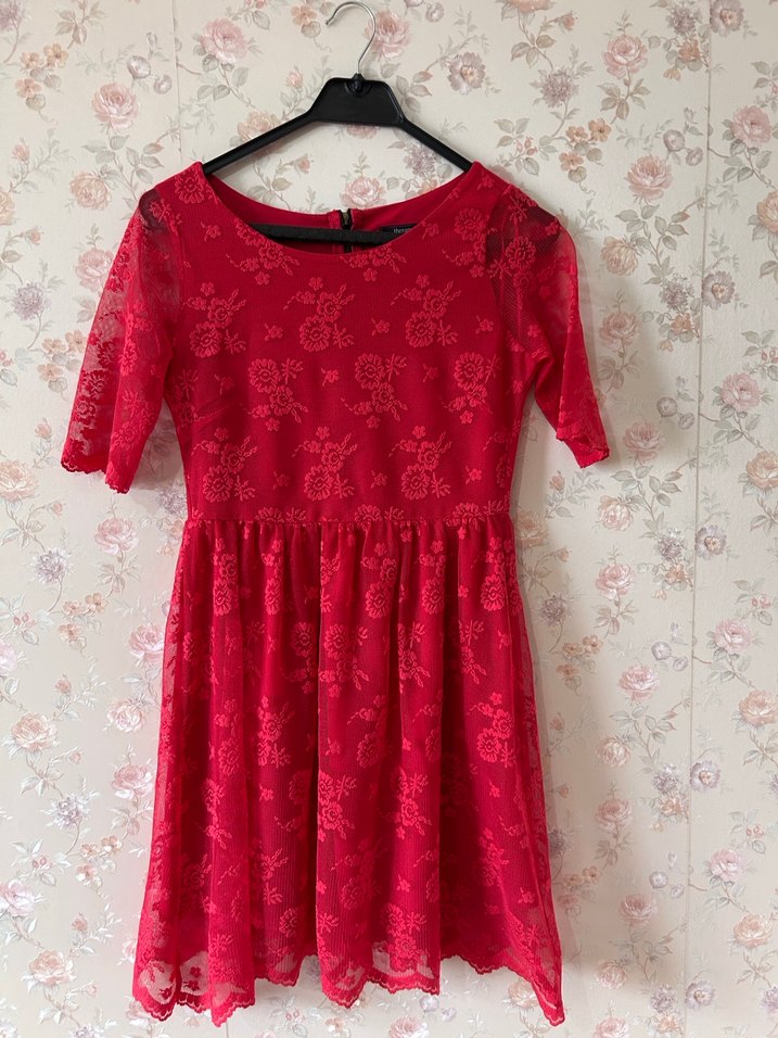 Kırmızı midi uzunlukta, dantel detaylı, kısa kollu ve yuvarlak yakalı bohem tarzda rahat kesim elbise. Romantik akşamlar için uygun.