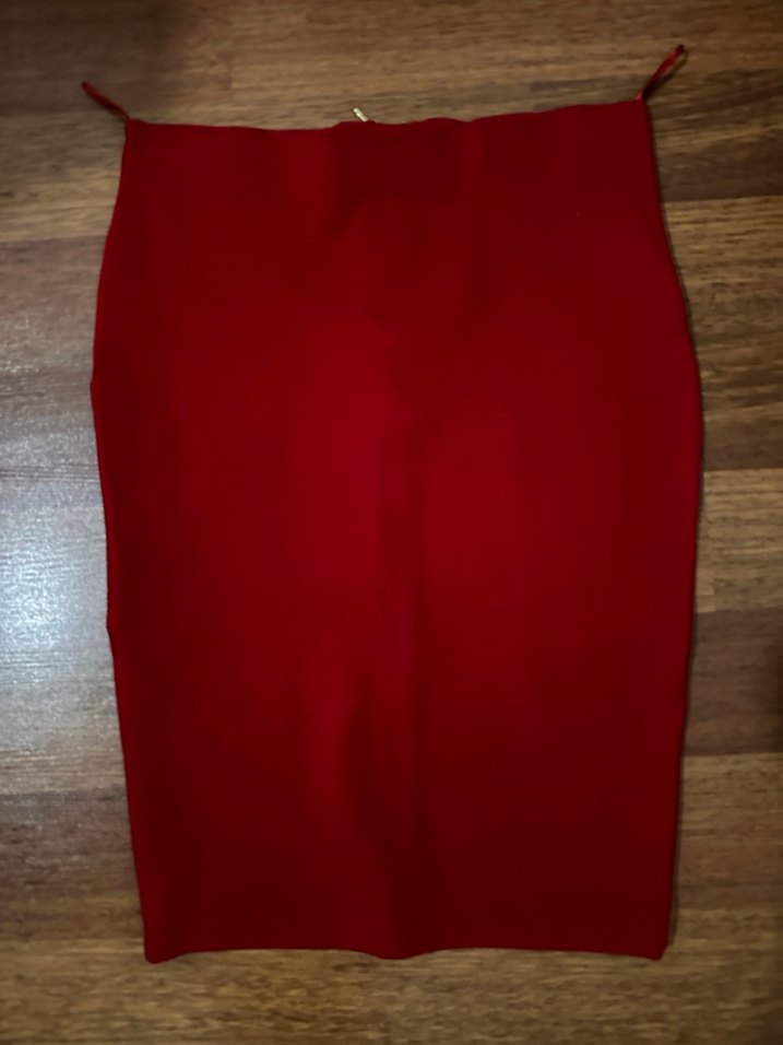 Parlak kırmızı renkte, dokuma kumaştan, midi boyda, içi astarlı, vücuda oturan kalem etek . Romantik akşamlar için uygun, sade ve minimalist tarzda. ❤️