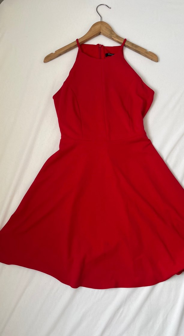 Parlak kırmızı kumaştan, yüksek yakalı, drapeli ve kolsuz, vücuda oturan midi abiye elbise. Romantik akşamlar için uygun.