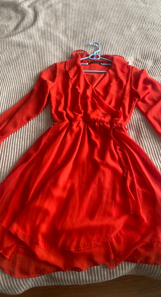 Kırmızı midi boy, drapeli ve V yakalı, uzun kollu, parlak kumaşlı dar kesim elbisedir. Romantik geceler için uygundur. ❤️