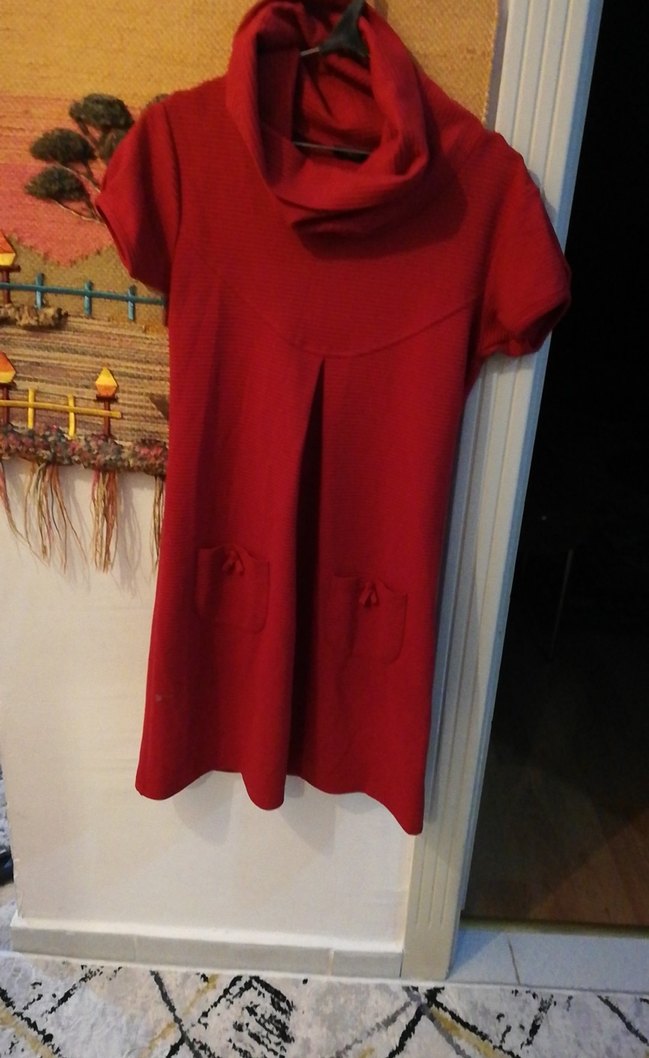 Kırmızı Midi elbise yüksek yakalı ve kısa kolludur. Bol kesimi ve yumuşak, sıcak kumaşıyla rahat ve gündelik kullanıma uygundur. Desensiz ve sade tasarıma sahiptir. Hiç kullanılmadı