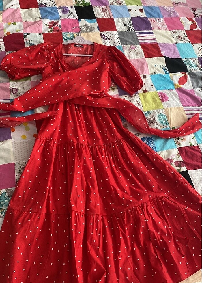 Çok iyi durumda kırmızı kendinden kuşak bağlamalı elbise midi boy